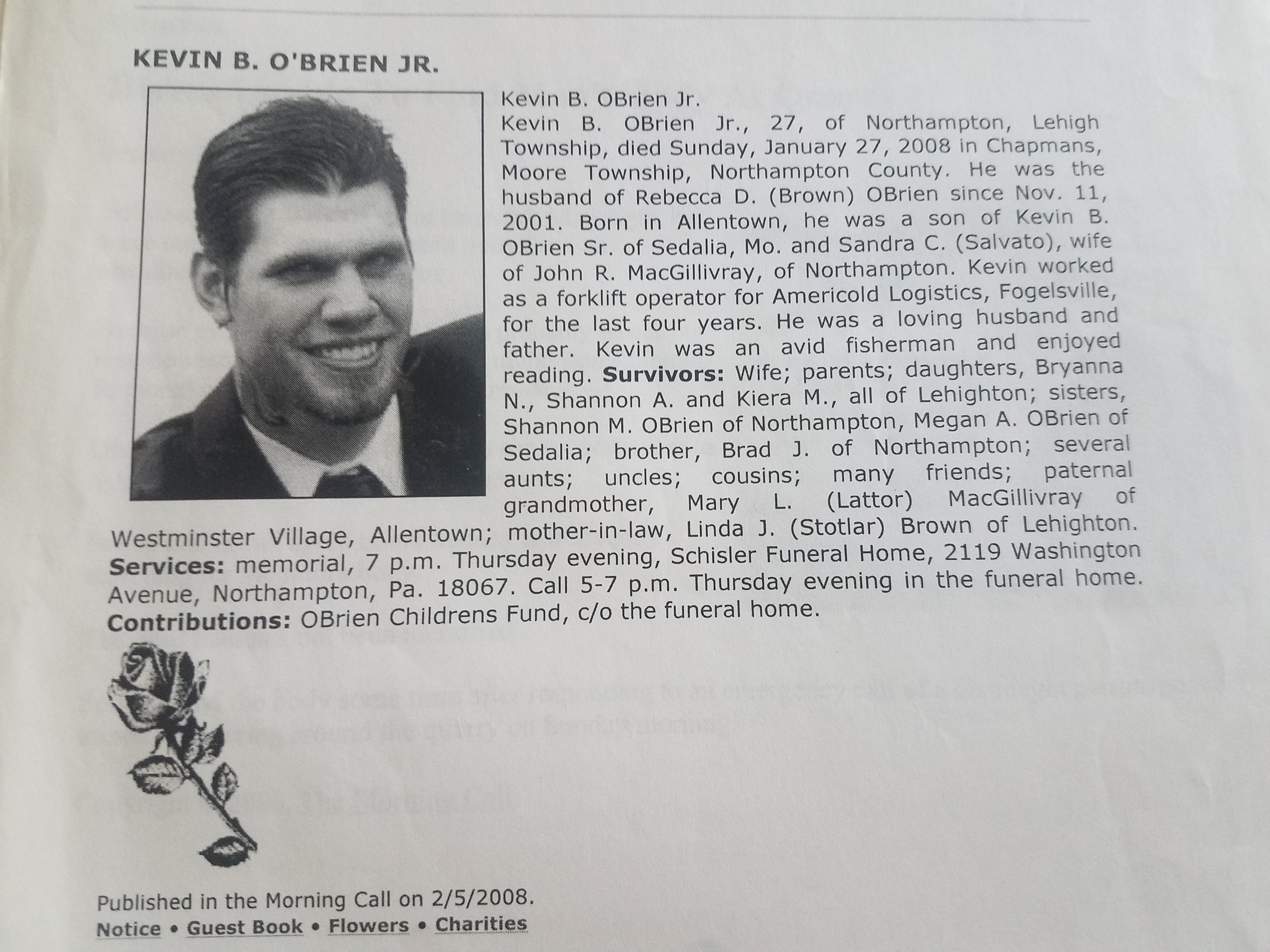The tears started lining up and collecting at the edges of my eyes but didn’t dare to fall yet. At that moment Becca and the girls walked in to sit in the front row. Kevin’s three girls : Bryanna, Shannon, and Kiera dressed in beautiful red plaid dresses. After seeing them a flood of thoughts and emotions filled my head. God, Kevin loved them so much. Those poor girls. Poor Becca. I can’t imagine how hard it must have been to tell them their father was gone. It brought back vivid memories of my mother having to tell me my father was dead when I was younger. “Bye daddy, I love you.” My childlike voice said. A flash of me kissing my father in his coffin filled my mind. The tears couldn’t hold on any longer. They started to run down my cheeks allowing the full-fledged sobs and sniffles to begin their performance. Sarah, my sister, grabbed my hand. She saw the girls as well and I know she was reliving the same pain that I was. The warmth and tight squeeze of Sarah’s hand helped to keep me whole. Without her support, I am pretty sure I would have had a full-on psychotic break that day. With the amount of pain surging through me, I can’t even begin to imagine how Kevin’s mother, stepfather, brother, and sister were feeling. It was a beautiful service, but an awful day for all of us.